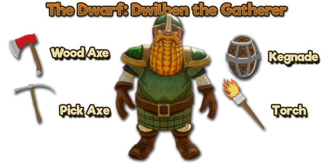 Dwilben is a very old and very simple Dwarf whose role in the mission is to gather the natural resources needed to help the wood-elves build a new colony. Dwarves live for centuries and in his first, at the age of 42, Dwilben went on a journey that is now a well known folklore of the Red Bearded Gatherer.