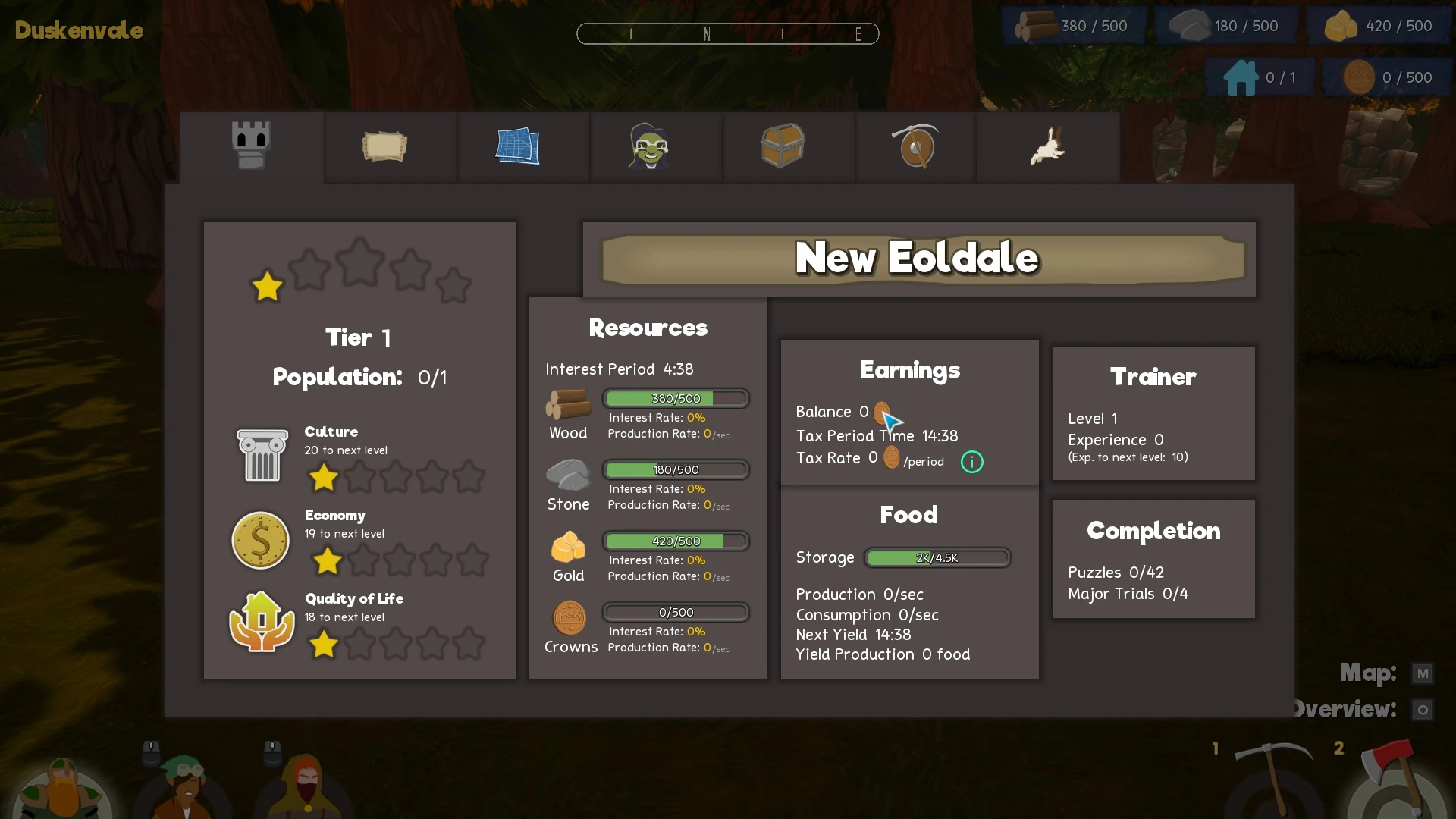 Displays the amount of wood, stone, gold, and crowns you have, as well as your interest and production rates for them once you unlock those structures.